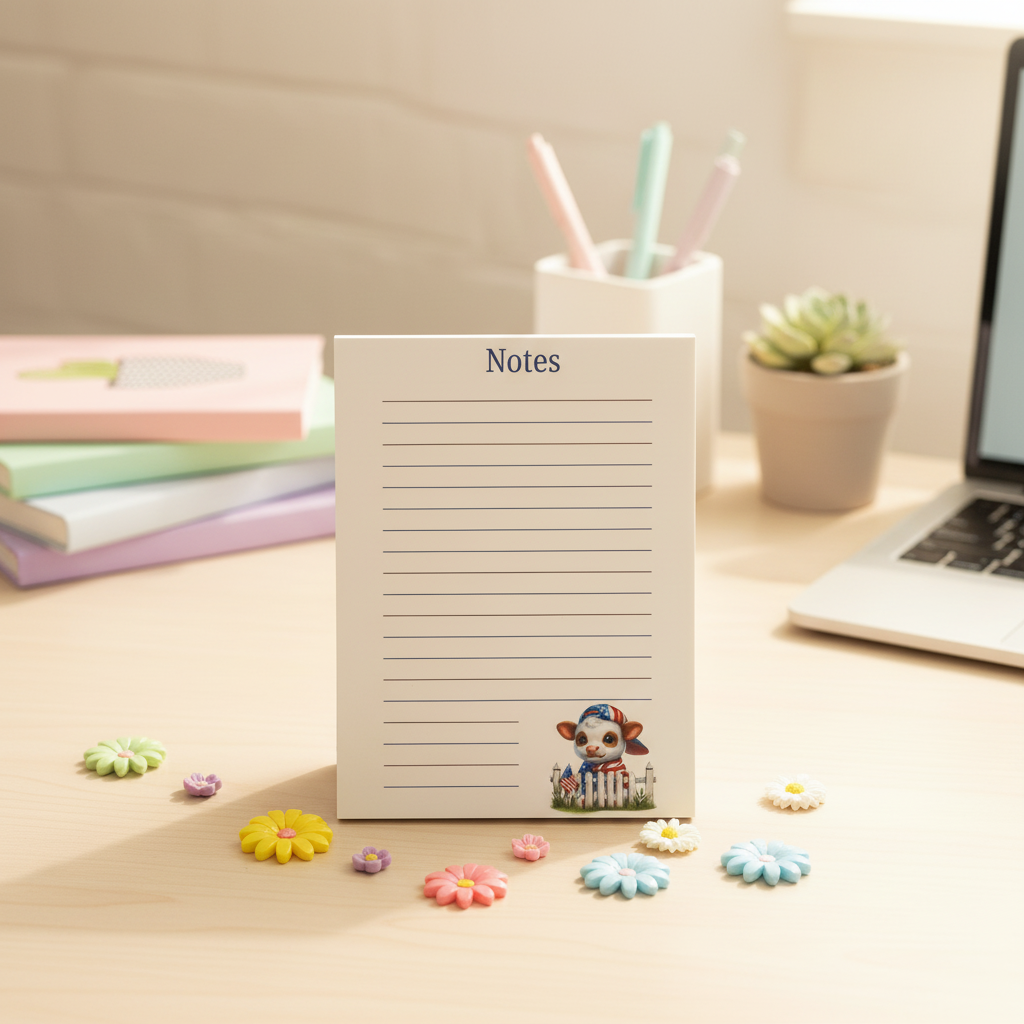 Featuring bright patriotic details and an adorable calf illustration, this notepad is perfect for lists, planning, journaling, and everyday writing.