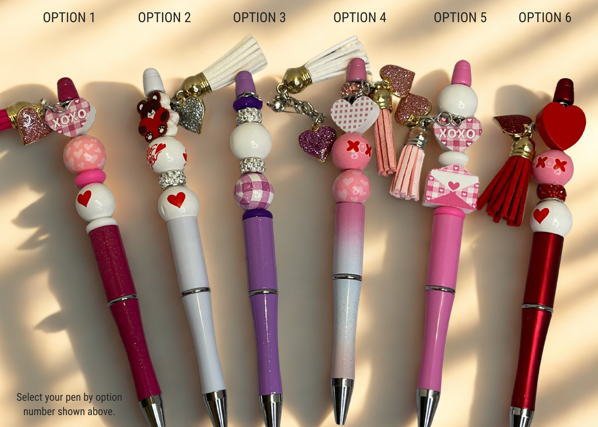 Due to the handmade nature of these pens and material availability, minor variations in bead colors or charm styles may occur. Any substitutions will always stay within the same Valentine color palette and overall design shown.